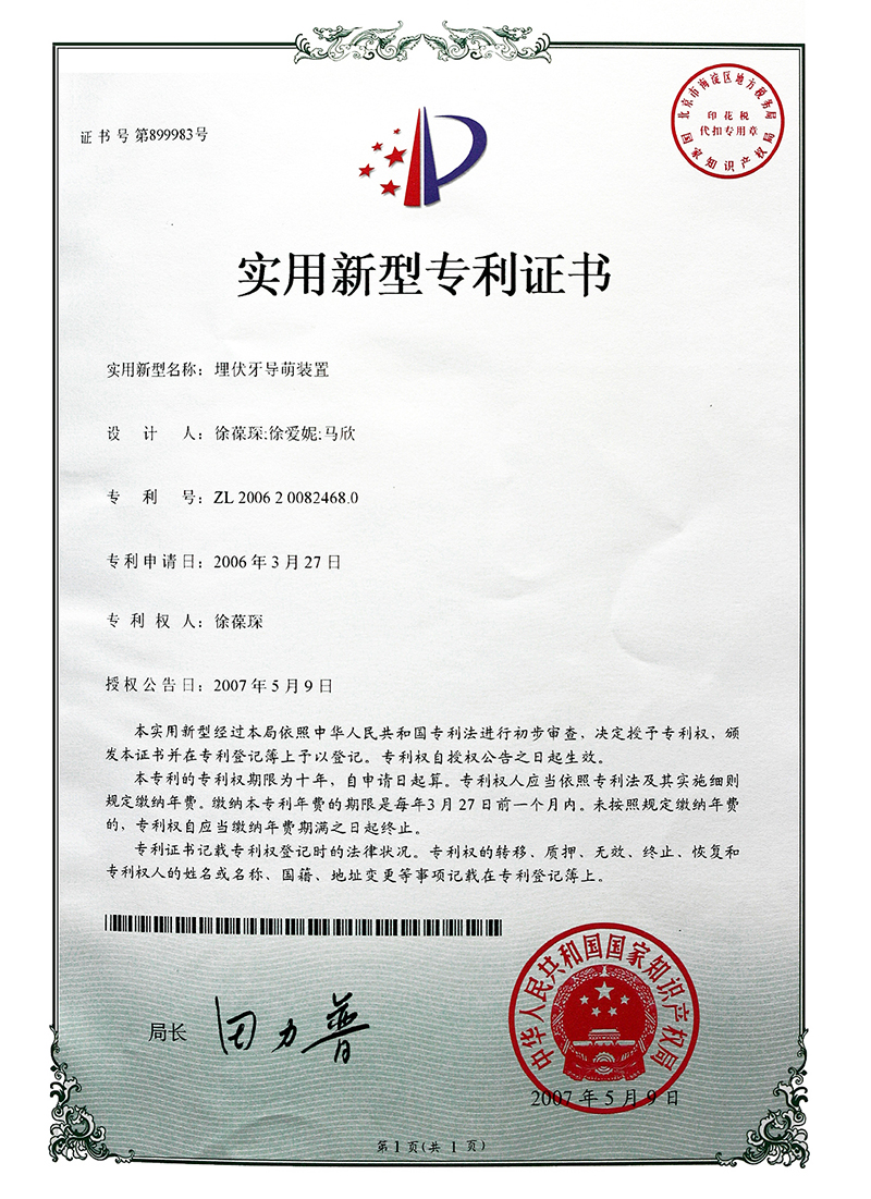 埋伏牙导萌装置专利证书-威海徐葆琛口腔诊所